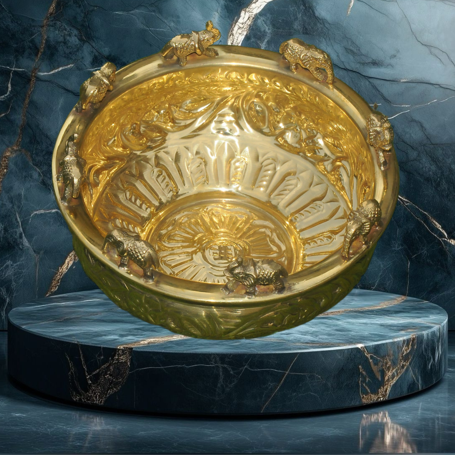 Regal, artistic, and steeped in tradition—our Elephant Urli is a statement piece that blends cultural heritage with timeless elegance. Featuring intricately designed elephant motifs around the bowl, this urli is a symbol of strength, prosperity, and positivity.